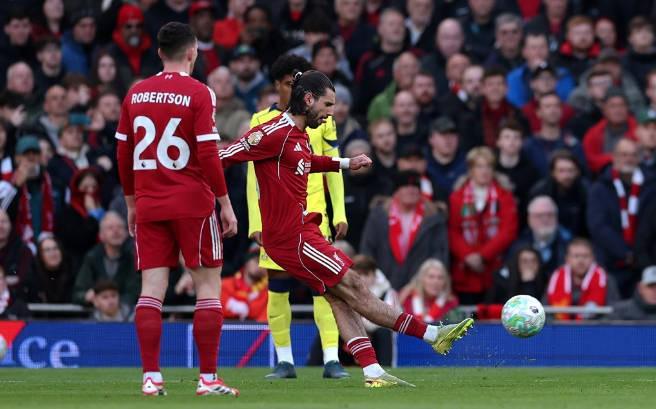 在今天凌晨进行的英超第30轮利物浦主场对阵热刺的比赛中,索博斯洛伊在第18分钟直接任意球破门,帮助球队取得1-0领先。